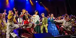 In 1976, the first remarkable success was the performance in Sochi at the All-Russian Soviet Song Contest.[16] Soon, three men have joined the girls'band. The band, led by Nadezhda Babkina, performed more than one hundred adaptations of Russian folk songs, created a large number of thematic concert programs, performances, folk acts ("Wedding", "Shrovetide", "Night Fortune-telling", "When the Sand Rises", "Russkaya pesnya collects friends" and others). Several shows became hits (arrangements of the songs "Moscow Golden-domed", "Dunin’s head fell ill", "How my mother wanted me", "If you want to be a military man", "Girl Nadia"). First, the composers Zhanna Kuznetsova and Vladimir Belyaev actively collaborated with the "Russian Song". The band composition has repeatedly changed. For many years, in the band have performed the Honored Artist of Russian Federation Tatyana Savanova (from the day of foundation), Vladimir Levashov, Nikolai Kuzmich.[13]