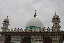 The Dargah (shrine) of Nadir Ali Shah is located in the dervish lodge of Nadir Ali Shah, which is situated southeast of the Shrine of Lal Shahbaz Qalandar. The iconic white and green dome is made of ceramic tiles.[31] The hemispherical dome rests on the square building, the corners of which are decorated with four minarets, made of mosaic ceramic tilework. The walls of the shrine are also covered from outside by the same mosaic tilework, making horizontal lines of white, red, green, yellow, blue, and black ceramic tiles, from top to bottom, giving an expression of pure delight.[13] In the interior delicate glasswork adorns the lofty ceiling and the dome. The walls are decorated from the inside with turquoise ceramic tiles and delicate glass work. Quranic verses have been carved in the glasswork on the northern wall. A large number of people visit the shrine daily and pay tribute to Nadir Ali Shah.[12]