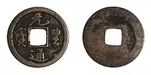 Nagasaki trade coins (長崎貿易銭), also known as Nagasaki export coins refer to Japanese mon coins specifically cast for export by the Tokugawa government between 1659 and 1685 during the Sakoku era. Though the inscriptions on the coins often match Chinese coins from the Song dynasty they’re often cast with different typefaces such as the fact that the Genpō Tsūhō (元豊通寳) produced at Nagasaki was in Clerical script while the Song dynasty’s versions were in Seal script and Running script. Due to the success of these coins they’re often still found in modern day Vietnam and Java, and were copied by contemporary Vietnamese mints as they had become the de facto standard coinage in Vietnam as native production had declined in the 17th century.[1][2] As the export of gold and silver was banned by the Qing dynasty Japanese merchants were most likely to go to Hanoi and Hội An to gain access to Chinese products causing these coins to start circulating en masse on the Vietnamese market. A special “5 elements” series of Nagasaki trade coins were also cast for export to Taiwan.