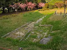 The Ninomaru gardens and other areas such as the Ofukemaru have a wide variety of flora. In spring, Japanese cherry, wisteria, camellia, and peony bloom. In the summer it is iris, crape myrtle, plantain lily, and hydrangea; in autumn the confederate rose, Japanese quince and crape myrtle, and in winter the Japanese witch hazel, Japanese quince, wintersweet, and Japanese plum that bloom.[56] During the summer, Sika deer can be observed grazing in the moats that are dry and covered with grass.[57] Various birds, such as ducks and songbirds, inhabit the castle grounds as their sanctuary in the middle of the city.