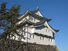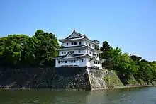 Called the Tatsumi turret, the southeast turret (東南隅櫓) looks like it has two stories, but it actually has three. The white coating on the mud walls made the structure both waterproof and fireproof. The southeast turret is similar to the southwest turret. The construction adheres to the original Tokugawa design. The symbol of a hollyhock, the crest of the Tokugawa clan, can be seen on the ridge-end tiles. The turret has been designated an Important Cultural Asset.[15]
