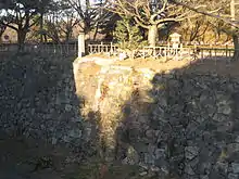 Located at the east gate is a very large stone built into the wall. According to legend, Katō Kiyomasa, a renowned general and castle engineer, hauled this large stone that was later named after him to the castle.[15] But it is probable that this part of the castle's foundation was constructed by Kuroda Nagamasa. Feudal lords who were ordered to build the stone walls carved their marks on their stones to distinguish them from the stones of other lords.