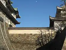 There is a roofless corridor between the main and the small keep. The walls in this corridor were earthen and stone. Mounted on the outer part of the west side are numerous 30 centimetre-long spearheads[15] to thwart enemy troops from climbing over the eaves. A similar sword-fence can be found at the Fumei Gate, facing the east side of the main keep.