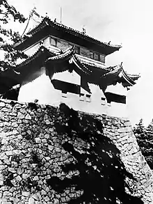 During World War II the castle was used as the Tokai district army headquarters and the administration office of the Nagoya POW camp.[4] The aerial bombardments of Nagoya by the United States Army Air Forces as part of the air raids on Japan brought the most destruction to the castle in its entire history. In January 1945 (Shōwa 20), the Sarumen Tea House was destroyed in air raids. On May 14, the main keep, small keep, golden shachi, Honmaru Palace, northeast turret, and other buildings were completely destroyed in air raids. In June of that year, some of the paintings saved from Honmaru Palace were moved for safekeeping to the Haiho Shrine, Toyota-shi. They returned in May 1946 (Shōwa 21).