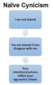 Naïve cynicism can be thought of as the counter to naïve realism, which is the belief that an individual perceives the social world objectively while others perceive it subjectively.[6]