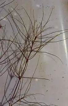 Najas guadalupensis is an annual, growing submerged in aquatic habitat types such as ponds, ditches, and streams. It produces a slender, branching stem up to 60 to 90 centimeters in maximum length. The thin, somewhat transparent, flexible leaves are up to 3 centimeters long and just 1 or 2 millimeters wide. They are edged with minute, unicellular teeth. Tiny flowers occur in the leaf axils; staminate flowers grow toward the end of the plant and pistillate closer to the base.[5][6][7] They are also a popular aquarium plant for beginners due to their hardiness as well as growth rate, which helps provide shelter for aquarium fish.[8][9]