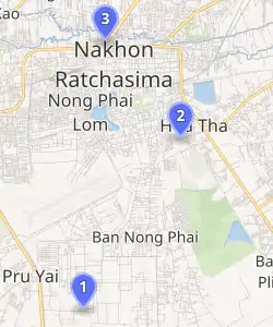 ![]() Locations of Suratham Phithak Military Camp (1), Wat Pa Sattha Ruam (2) and Terminal 21 Korat (3), in Nakhon Ratchasima Province | |