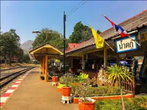 Nam Tok railway station is a railway station located in Tha Sao Subdistrict, Sai Yok District, Kanchanaburi. The station is a class 2 railway station, located 194.24 km (120.7 mi) from Thon Buri railway station. Nam Tok is the current terminus for daily trains from Bangkok on the Death Railway line. However, an excursion train from Bangkok during the weekends continues to Nam Tok Sai Yok Noi Halt, a few kilometres from the station.