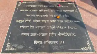 The Namantar Shahid Smarak (English: Name Change Martyrdom Memorial) is located at Indora Bridge 10 on Kamptee Road, Nagpur.[1] That location was selected because that is where Avinash Dongre, a child protesting in support of the Namantar Andolan, was shot in the head by police on 4 August 1978.[20][21] Four others - Dilip Ramteke, Abdul Sattar, Roshan Borkar and Ratan Mendhe - also lost their lives nearby.[20] The memorial has a total of 27 sculptures of Bhim Sainiks (Soldiers of Bhim)[1] who died during the pogroms. They are shown in the act of their struggle.[22] In addition to the sculptures, there are 27 plaques with the name of each person;[18] the memorial also has a monolith to pay homage to the martyrs. Along with the monument, there is a mini-theater for plays and discussions and a nearby library with materials related to the history of the Namantar Andolan.[22] The memorial was built by contractor Sunil Sharma on 2,225 m2 of land at a cost of ₹1.58 crore (approximately US$259,000).[1]