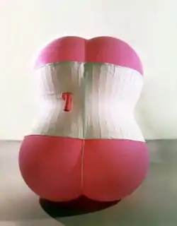 Nancy Davidson is an American artist best known for large-scale inflatable sculptures regarded as hyper-feminized abstractions of the human female form.[1][2][3][4] Bulbous and flesh-like, the sculptures resemble buttocks and breasts and employ erotic cultural signifiers in their shape and decoration.[5][6][7] Davidson's work spans art media but centers around sculpture. It is largely post-minimal in character and described by commentators as providing a feminist counterpoint to the male-dominated, minimalist sculpture of the 1960s, as well as to cultural tropes involving bodies that the works themselves invoke.[8][9][10][11] Of particular note are Davidson's use of humor and a sense of absurdity to seemingly both celebrate and subvert these tropes, inviting their investigation but without the seriousness and moralism that often accompany critical works.[12][13][14][15] Sculpture Magazine critic Robert Raczka wrote that "The confectionary color and oversize scale" of Davidson's sculpture creates a "playfully upbeat mood that allows feminist and gender issues to rise to the surface at irregular intervals, without didacticism."[14] The New Art Examiner's Susan Canning described it as establishing "a context where all can revel in the transgressive and liberating power of the grotesque."