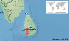 The Sri Lanka rock frog is endemic to south, central and western Sri Lanka where it is found in wet tropical forests at altitudes of up to 1,200 metres (3,900 ft) above sea level. It is a largely aquatic species and occurs in fast flowing mountain streams, under boulders and on wet rocks beside waterfalls. It is also found on land in disturbed areas where there are suitable breeding locations such as wet seeps. The tadpoles are semi-terrestrial and are sometimes found on wet rocks beside torrents.[1][5]