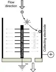 The electrostatic particle collector charges the dry particles' surface and deflects them with an electrical field. To produce the electrical field, a high voltage (16 kV) is applied to a round collector tube. The electrical field builds up between the inner wall of the collector tube and the tips of a grounded star electrode. To have a low level of energy in the system the current is very low.