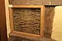 An example of the mediaeval horizontal hazel-wattle between the oak beams. They were 'sprung' into groves cut into the frame and interwoven round upright oak 'spars' also sprung into the frame. This exposed piece dates to c. 1435.[10]