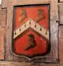Attributed arms of Ednyfed Fychan (an ancestor of Owen Tudor), used and quartered by Wynne of Coed Coch and of Plas Uchaf. Description: "Gules a chevron ermine between three men's heads in profile erased proper." The ermine can also be seen on the national flag of Brittany. Ednyfed is said to have first come to notice in battle, fighting against the army of Ranulph de Blondeville, 4th Earl of Chester, who attacked Llywelyn at the behest of King John of England. Ednyfed cut off the heads of three English lords in battle and carried them, still bloody, to Llywelyn, who commanded him to change his family coat of arms to display three heads in memory of the feat.[9]