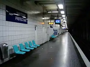 Nanterre-Préfecture is an underground station located close to the prefecture of the department of Hauts-de-Seine, hence the name. The central part of RER A, as well as A1 to Germaine-en-Laye, are operated by RATP. The branches A3 to Cergy and A5 to Poissy are operated by SNCF. The station has the central platform, where trains depart to the center of Paris, and two side platforms, one for A1 and one for A3/A5.