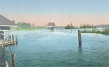 The scenery of the lakes, however, would make tourism the dominant industry. Visitors in the 19th century included Henry Wadsworth Longfellow and Nathaniel Hawthorne. To accommodate his passengers, Charles L. Goodridge of the Sebago Lake, Songo River & Bay of Naples Steamship Company built a hostelry on a knoll at the southern end of Long Lake. On July 26, 1899, the Bay of Naples Inn opened with 80 bedrooms. It was designed by John Calvin Stevens, who reduced by two-fifths a plan originally created for the ill-fated Metallak Hotel in Colebrook, New Hampshire. While under construction, the Metallak was destroyed in April 1893 during a violent windstorm, and its investors abandoned the project. The Bay of Naples Inn, which faced Mount Washington and the east side of the White Mountains, was a popular resort during the early 20th century. Automobile tourists began arriving after designation of the Theodore Roosevelt International Highway in 1919 (identified as United States Route 302 since 1935).[8] The Bay of Naples Inn remained open through the 1951 season, but in 1964 was deemed unprofitable and razed.[9]
