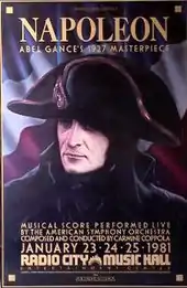 Brownlow's 1980 reconstruction was re-edited and released in the United States by American Zoetrope (through Universal Pictures) with a score by Carmine Coppola performed live at the screenings. The restoration premiered in the United States at Radio City Music Hall in New York City on 23–25 January 1981; each performance showed to a standing room only house.[13] Gance could not attend because of poor health. At the end of 24 January screening, a telephone was brought onstage and the audience was told that Gance was listening on the other end and wished to know what they had thought of his film. The audience erupted in an ovation of applause and cheers that lasted several minutes. The acclaim surrounding the film's revival brought Gance much-belated recognition as a master director before his death eleven months later, in November 1981.[25]