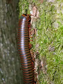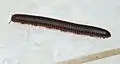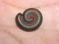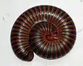 Narceus americanus is a large millipede of eastern North America. Common names include American giant millipede,[1] worm millipede, and iron worm.[2] It inhabits the eastern seaboard of North America west to Georgetown, Texas, north of the Ottine wetlands.[3] It has a nearly cylindrical gray body, reaching a length of 4 inches (100 mm).[4] They can be commonly found in or under decaying logs from March to October.[5] When threatened, they sometimes curl up or release a noxious liquid that contains large amounts of benzoquinones which can cause dermatological burns. This fluid may irritate eyes or skin. Many other millipedes secrete hydrogen cyanide, and while there have also been claims that N. americanus releases hydrogen cyanide, this is not true. They do however, excrete a substance that causes a temporary, non-harmful discoloration of the skin known as millipede burn.[6]
