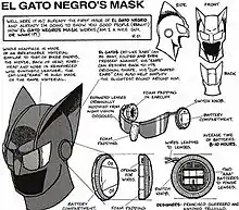 El Gato Negro would become grounded in Mexican and Tejano folklore and popular culture, including a large influence from the Lucha Libre traditions. Various aspects of the character's personality and visual design were directly inspired by some of Dominguez's favorite comic book superheroes including The Spirit, The Crimson Avenger, Daredevil, Nightwing and most noticeably Batman.[10][11] He also drew inspiration from Walter B. Gibson's The Shadow and Johnston McCulley's Zorro, as well as Lee Falk's comic strip The Phantom.[10] Elements from Japanese animation, manga, and martial arts films also aided in the development of El Gato Negro's costume design and equipment. The example of Judge Margarito Garza's Relampago character helped Dominguez pursue his creation in a self-published format.[12]