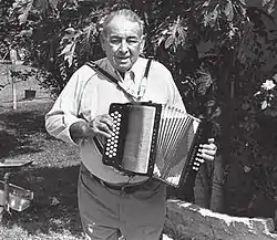 Narciso Martínez (October 29, 1911 in Reynosa, Mexico[1] – June 5, 1992 in San Benito, Texas[2]), whose nickname was El Huracan del Valle ("The Hurricane of the Valley"),[3] was a Mexican folk musician. He began recording in 1935 (or 1936) and is the father of conjunto music. The Spanish word conjunto means 'group' and in El Valle de Tejas that means accordion, bajo sexto, and contrabajo (string bass, known locally also as "el tololoche"). The same year, he and Santiago Almeida recorded their first 78 rpm record containing the polka "La Chicharronera" and the schottishche "El Tronconal" for Bluebird Records,[1] which quickly became a success.[4]