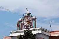 The temple has a three-tiered gateway tower and all the shrines of the temple are enclosed in concentric rectangular granite walls. The temple occupies an area of around 0.5 acres (0.20 ha). The central shrine houses the image of Narthana Vallabeswarar in the form of Lingam. The shrine of Ishta sakthi and Parasakthi, the consorts of Shiva facing West is located in the Mahamandapam leading to the sanctum. The central shrine is approached through the flagstaff and Mahamandapam, both which are located axial to the gateway. As in other Shiva temples in Tamil Nadu, the shrines of Vinayaka, Murugan, Navagraha, Chandikesa and Durga are located around the precinct of the main shrine. There is a shrine of Chitragupta, the accountant of Yama located in the temple.[2] Unlike other temples, there is no separate shrine for Navagraha, the nine planetary deities. The panels of the walls around the sanctum houses the Koshta images like Dakshinamurthy, Lingodbhava, Brahma and AshtabhujaDurga. The shrine of Nataraja houses the metal image of Nataraja while there is a festival image of Chitragupta holding pen in one hand and script in the other.[3]