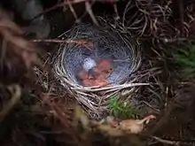 Nashville warblers conceal their nests on the ground under shrubs. Nests are open cups built out of bark strips, leaves, and moss, and are lined with fine materials such as feathers or hairs. Typically four or five eggs are laid in a clutch, and incubated for 11–12 days. Only the female incubates the eggs, though the male brings her food. On hatching, the young have no feathers apart from some brown down, and their eyes are closed.[8] Juveniles fledge and leave the nest 11 days after hatching.[9]