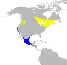 Nashville warblers breed in two distinct areas, one in Canada and the northeastern United States, and another in the western United States. The northeastern part of its range extends from Côte-Nord and Cape Breton Island in eastern Canada to central Alberta. For the most part, it only breeds between about 52 and 45.5 degrees north, but it is also found less commonly in the Appalachians of Pennsylvania and West Virginia. Although named after Nashville, Tennessee, the Nashville warbler only visits that area during migration. They migrate to southernmost Texas and California, mid-Mexico, and the northernmost parts of Central America (Guatemala and El Salvador) in winter. In their breeding range, they prefer open mixed woods and bog habitats.[8]