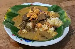 Nasi gandul or in Javanese sega gandhul (Hanacaraka: ꦱꦼꦒꦒꦤ꧀ꦝꦸꦭ꧀) is a rice dish served in rich, sweet, savoury and spicy beef soup, specialty of Pati Regency, Central Java, Indonesia.[1] Nasi gandul consists of steamed rice topped with slices of beef served in spicy soup with savoury flavour in golden-brownish colour.[2] Nasi gandul is somewhat quite similar to other Indonesian dishes; beef semur, tongseng and Javanese gulai.