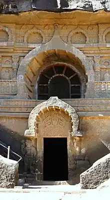 The Nasik Caves,[1] or Trirashmi Leni (Trirashmi being the name of the hills in which the caves are located, Leni being a Marathi word for caves), are a group of 23 caves carved between the 1st century BCE and the 3rd century CE, though additional sculptures were added up to about the 6th century, reflecting changes in Buddhist devotional practices.[2][3] The Buddhist sculptures are a significant group of early examples of Indian rock-cut architecture initially representing the Hinayana tradition.