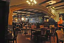 In the 1930s Edger Palmer, a major donor to Princeton University and leading figure in the town, desired to bring an urban redevelopment to Princeton similar in concept, if not scale, to Rockefeller Center in New York. This led to the 1936–1939 creation of Palmer Square, a public square and planned development that combines stores, restaurants, and apartments, with a post office and a new building for the Nassau Inn.[6] The original buildings of the Inn were demolished; their former site is now Tiger Park, with a tiger statue commemorating Edger Palmer, standing opposite Nassau Presbyterian Church. The new Inn was built facing the square and has itself come to be considered historic with its fine interiors and Norman Rockwell mural in the Yankee Doodle Tap Room.[7]