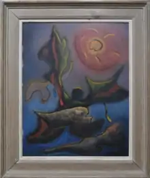 From March 24-April 11, 1947, Daphnis had an eponymous solo exhibition at the Contemporary Arts Gallery at 106 E 57th St, New York at which his biomorphic paintings were featured. The exhibition included both oil paintings and watercolors. It was his second show at the gallery and in his catalog essay, art historian Gordon B. Washburn found new promise in the works: "There is hardly one of them, nevertheless, which in its far distances or on its horizon, has failed to keep a promise of renewed life and ultimate happiness. Once, in his youthful years, Daphnis painted a vision of heaven and hell; but in those days his purgatory was as charming as his paradise, the devils a toy army. A new definition of good and evil has now been found, and in returning to a world of greater hope and faith he seizes the beauty of the natural world - especially its plant-life whose forms he has always deeply loved - with a thicker complex of emotions. His self-taught art, once picked out with one finger, its tunes like those heard on a sweet but lonely hillside from a shepherd's flute, are not polyphonic. Planning, close organization, and definition enter the pictures; and with those controls comes an abstraction which is increasing."[1]