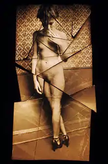 Focusing on the construction of female identity, Entre Quatre Murs, Berlin, is a series of compositions involving women and space. Each image is a composite of elements, separated from the original photograph and printed on layers of transparent orthochromatic film. By superimposing these layers, the image is reconstituted three-dimensionally. This sequence of three-dimensional portraits transparentizes the female body, as Daoust interweaves her subjects with their surroundings until the distinction between self and environment almost disappears. By dissolving these confines dividing external and interior, the scenes reflect and suggest a microcosmic snapshot of the mind.