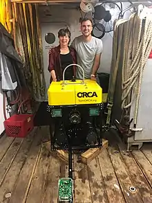![]() Robinson (right) and Edith Widder (left) with the MEDUSA - a deep-sea camera that recorded the first-ever footage of a live giant squid in the waters of Japan and the US. | |