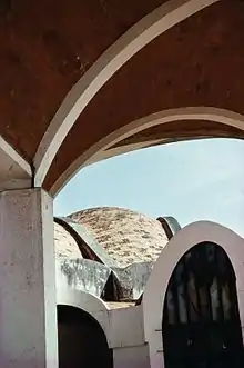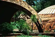 From the top of the golf course's ravine, one looks down upon the ballet school complex, nestled into the descending gorge. The plan of the school is articulated by a cluster of domed volumes, connected by an organic layering of Catalan vaults that follow a winding path. There are at least five ways to enter the complex. The most dramatic entrance starts at the top of the ravine with a simple path bisected by a notch to carry rainwater. As one proceeds, the terra cotta cupolas, articulating the major programmatic spaces, emerge floating over lush growth. The path then descends down into the winding subterranean passage that links the classrooms and showers, three dance pavilions, administration pavilions, library and the Pantheon-like space of the performance theater. The path also leads up onto its roofs which are an integral part of Garatti's paseo arquitectonico. The essence of the design is not found in the plan but in the spatial experience of the school's choreographed volumes that move with the descending ravine.[15]