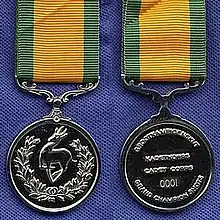 The National Cadet Bisley Grand Champion Medal is a military medal which was instituted by the Republic of South Africa in 1987. Originally named the Cadet Corps Grand Champion Shot Medal, it was awarded to the Grand Champion of the annual National Cadet Bisley of the School Cadet Corps.[1]