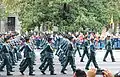The celebration traditionally includes a parade of the Spanish Armed Forces (military) and the State Security Forces (law enforcement), usually held in Madrid, attended by high institutional and political representatives including the King of Spain, head of state and commander-in-chief of the Armed Forces, together with the Royal Family, the Prime Minister, the Presidents of the Cortes Generales and faction leaders of its chambers, and the President of the Supreme Court and General Council of the Judiciary, members of the cabinet, deputies and senators of the Cortes and other representatives of the central government and the governments of the autonomous communities of the state. Political and institutional delegations from other guest countries, including military forces participating in the parade, also attend the event. The parade expresses the commitment of the Armed and the State Security forces to society and their contribution to the wider international community.[25] The parade is held in one of the capital's big plazas, in recent parades the marching contingents are assigned the Paseo de la Castellana for the parade as a marching route.