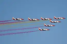 But the most important role is usually reserved for the Spanish flag, a symbol of unity and of national coexistence. For several consecutive years, the Spanish Air Force aerobatics parachute demostration unit has performed a jump carrying a massive Spanish flag to land in front of the Royal dais where the King, as Commander in Chief of the Armed Forces, who serves as the event's chief guest of honor, is present together with the Queen and members of the Royal Family, the Minister of Defense and the Chief of Defense Staff. Then the tribute to the national flag follows, with its raising while the national anthem, the "Marcha Real," is performed. Then, tribute is paid to the soldiers who gave their lives for Spain which is followed by a civil-military parade with mobile column and flypast segment, which usually includes a display by the Spanish Air Force's aerobatics team, the Patrulla Águila.