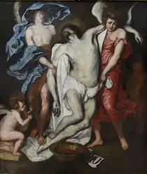 Flemish art school is represented by remarkable pieces including "Procession of Silenus" by Peter Paul Rubens,[13] "Descent from the Cross" by Anthony van Dyck,[14] outstanding still-life paintings by Verbruggen and Jan Fyt and "Mountain landscape" by Joos de Momper. Portrait genre is represented by several canvases,[15] most notable ones are woman portrait by Pieter Pourbus and portrait by unknown artist of the 17th century. Two works of David Teniers the Younger disclose genre painting. Work of comparatively little-known artist Jan Cossiers "Faun visiting peasants" is an example of realism art.