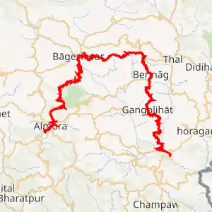 The Almora-Bageshwar stretch of this Highway was a part of the provincial 'Almora-Joshimath cart road' during the nineteenth century.[3] The road had a steep descent on the way to Thakla (now Takula), and was surrounded by dense forests of Oak and Rhododendrons. However, the hills were covered by very fine Cheer forests between Thakla and Bageshwar.[3] Later in 1909; several sections of the highway were recorded in the Almora Gazetter as "III class local roads", including the 24 mile 'Gangolihat to Dharamghar road' and the 22 mile 'Bageshwar to Berinag road'.[4]