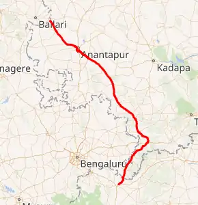 In Andhra Pradesh, it passes through Anantapur, Kadiri, Madanapalle, Punganur and Kuppam. In Tamil Nadu, it connects Krishnagiri with its junction with NH 44.[4]