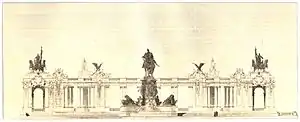After the death of Wilhelm I in the Year of Three Emperors (1888) an open competition for the establishment of a national monument in his memory was tendered the next year. The first competition, in which the architect Bruno Schmitz with the draft "Imperial Forum" was chosen,[1] did not bring the desired results. So in 1891 a second, limited bid to only eight selected artists was tendered. The construction base of the monument was laid down on the west side of the City Palace, along the Spree Canal. The design of Reinhold Begas and Gustav Halmhuber was eventually chosen.
