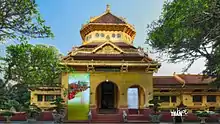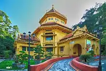 The museum is housed in a colonial French building which is a cupola shaped edifice in the shape of a pagoda. The design of the building is an amalgamation of French and Chinese architecture known as Indochina architecture.[1][5][4] The building designed by Hebrard, incorporates double walls and balconies for a natural ventilation system and protection from sunshine.[4] The exhibition area is more than 2,200 square metres (24,000 sq ft) with exhibits arranged chronologically.[2] It is divided into five major sections: Section 1 covers period from the prehistoric period from the Stone Age (30,000–40,000 years ) to 4,000–5,000 years ago; Section 2 has displays from the time of nation building during the Tran Dynasty; Section 3 has exhibits from the period of the Ho Dynasty to the August 1945 Revolution; and Section 4 has artifacts of the Champa stone sculptures.[6] The museum showcases Vietnam's history with very large collection of about 200,000 items, covering the Neolothic age, Bronze Age, Sa Hunh, Oc Eo, and Hung periods, Nguyen dynasty, Cham period, and also northern Vietnam's Dong Son, a culture which existed about 1000 BC-100 AD.[7][5] These exhibits are in the main building. The exhibits highlight communism and depict the rule of the French colonists as cruel.[7]