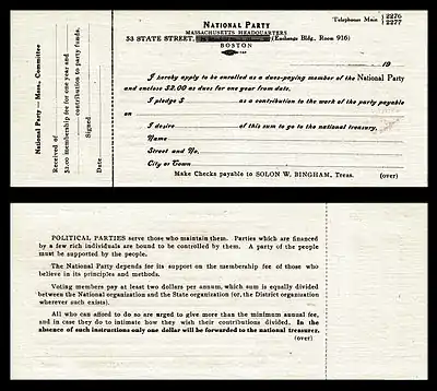 The National Party was funded by annual dues payments by its members, based according to the means of the party member, but of not less than $2 per annum. One dollar of this amount was to be retained by the national organization to fund its operation, while the other dollar was to rebated to the state organization for its own support. Party members were to receive membership cards and a periodic bulletin was planned. Those not wishing to cast their lot with the organization as full members could gain "sympathizer" status through the purchase of an annual button for fifty cents.[1]