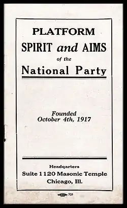 - Platform, Spirit and Aims of the National Party: Founded October 4th, 1917. Chicago: The National Party, 1917; pp. 11–12.