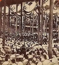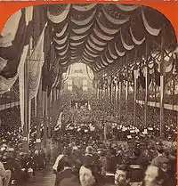 The National Peace Jubilee was a celebration that commemorated the end of the American Civil War, organized by Patrick Gilmore in Boston from June 15-19, 1869. It featured an orchestra and a chorus, as well as numerous soloists. More than 11,000 performers participated, including the famous violinist Ole Bull as the orchestra's concertmaster,[1] and Carl Zerrahn as director of the choral forces.[2] The Jubilee became the "high-water mark in the influence of the band in American life".[3] Along with the World's Peace Jubilee and International Musical Festival in 1872, it made Gilmore a famous composer and bandmaster. For the Jubilee, a newly commissioned "Hymn of Peace" was written by Dr. Oliver Wendell Holmes, set to the music from "American Hymn" by Matthias Keller (1813-1875) and performed on the opening day.[4]