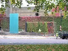 The memorial consists of two distinct architectural elements, linked by a terrace of Purbeck stone.[3] A black rectangular creeper-covered enclosure surrounds the air shaft, forming a single block. The northern face of the enclosure is kept free of creepers, and is inscribed with the police badge of office and the text "The National Police Memorial: Honouring Those Who Serve". This face also includes a vitrine in which the Roll of Honour is displayed.[14]