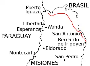 In 2006 the Dirección Provincial de Vialidad paved the section between Bernardo de Irigoyen and San Antonio.[1] The next 30 km (19 mi) until the rural area known as Piñalito Norte were completed in mid-2007. The section between Piñalito Norte and Provincial Route 19 is under construction.[2] The following 44 km (27 mi) until Puerto Iguazú International Airport is unpaved, while the section from the airport to the junction with National Route 12 is paved.