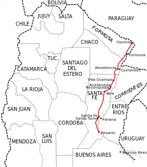 National Route 11 (RN11), known officially as Carretera Juan de Garay, is a road in Argentina, which runs through the provinces of Santa Fe, Chaco, and Formosa. From its beginning in the Rosario Beltway until it ends at the San Ignacio de Loyola International Bridge, on the border with Paraguay, it covers 980 km (610 mi), fully paved. In Formosa Province, the 80 km (50 mi) highway is under construction between the intersection with National Route 81 to the north of the City of Formosa and the town of General Lucio V. Mansilla on the shores of the Bermejo River bordering the Chaco Province.