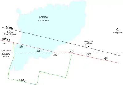 Due to the growth of Laguna La Picasa (es:Laguna La Picasa) between 1998 and 1999, 14.5 km of the road was flooded. The affected area was between Aarón Castellanos and Diego de Alvear, along the border between the provinces of Santa Fe and Buenos Aires. This prompted the road to be rerouted on 19 April 1999.[18]