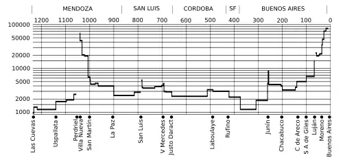 The graph on the left shows the height of the road between the junction with National Route 40 on the outskirts of Mendoza city and Avenida General Paz.[40]